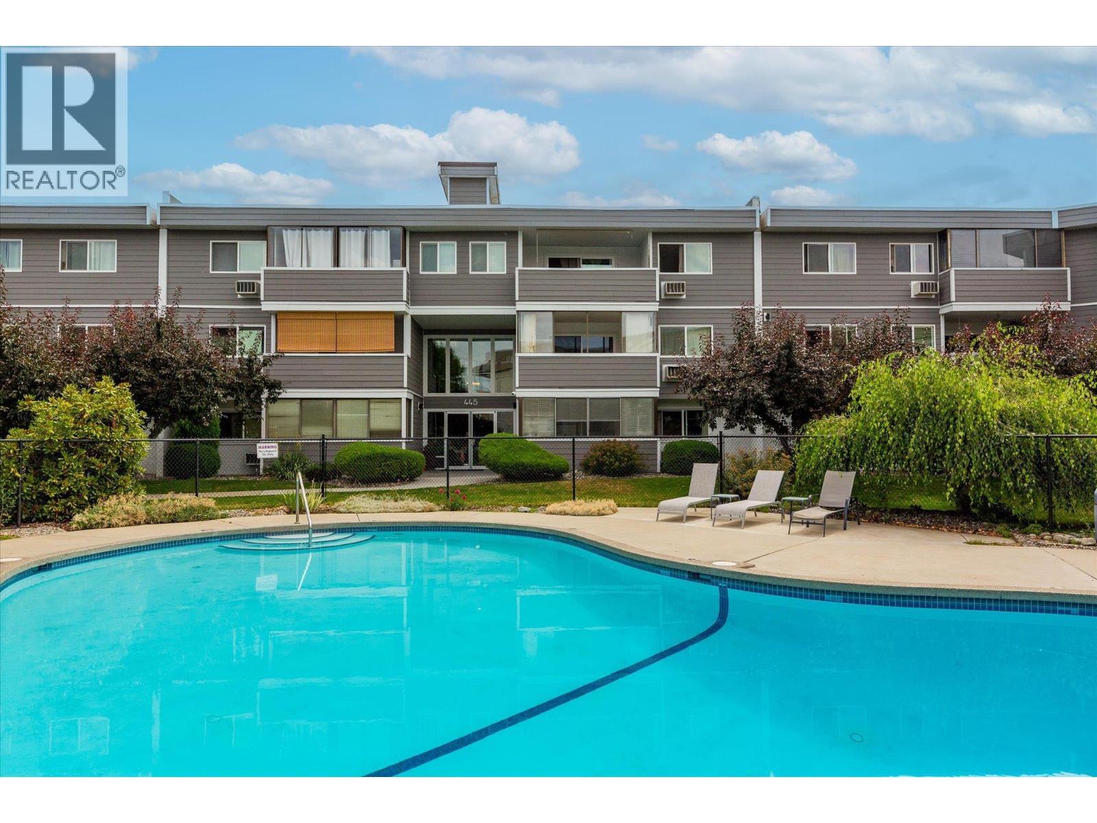 Welcome to Kelowna House, 445 All Star Court, Unit #106, a well-kept community with an outdoor pool and a relaxed vibe. This freshly painted, move-in-ready 673 sq.ft. ground-floor unit offers open-concept living, a cheater 4-piece bath, and an east-facing enclosed glass deck, a private, year-round retreat surrounded by natural greenery. Features include three appliances, wall A/C, and one secure underground parking stall. Strata fees are quite reasonable, covering access to the pool and common areas. Quietly tucked within the complex, this suite offers comfort and convenience in equal measure. Great walkability, close to shopping and park. (id:6769)
